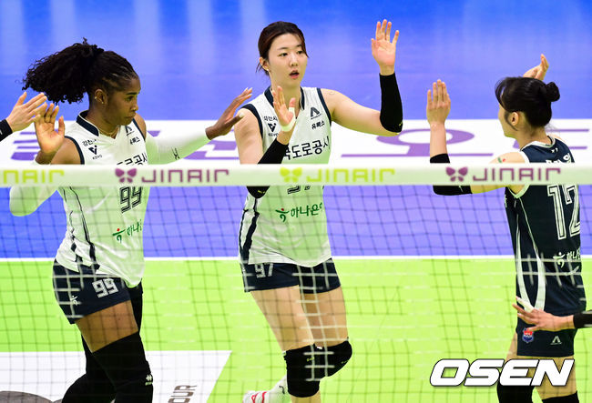 1세트 한국도로공사 강소휘가 동료들과 하이파이브를 하고 있다. 2026.02.24 /cej@osen.co.kr