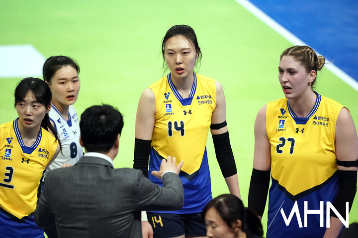 (MHN 수원, 박태성 기자) 24일 경기도 수원실내체육관에서 '진에어 2025~2026 V-리그' 여자부 6라운드 현대건설(2위 56점 19승 11패)과 한국도로공사(1위 59점 21승 9패) 경기가 열렸다.