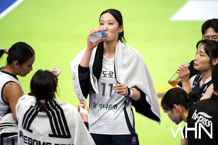 (MHN 수원, 박태성 기자) 24일 경기도 수원실내체육관에서 '진에어 2025~2026 V-리그' 여자부 6라운드 현대건설(2위 56점 19승 11패)과 한국도로공사(1위 59점 21승 9패) 경기가 열렸다.