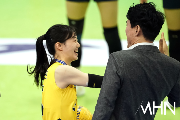 [mhn포토] 김다인, 강성형 감독 기다려 파워 하이파이브
