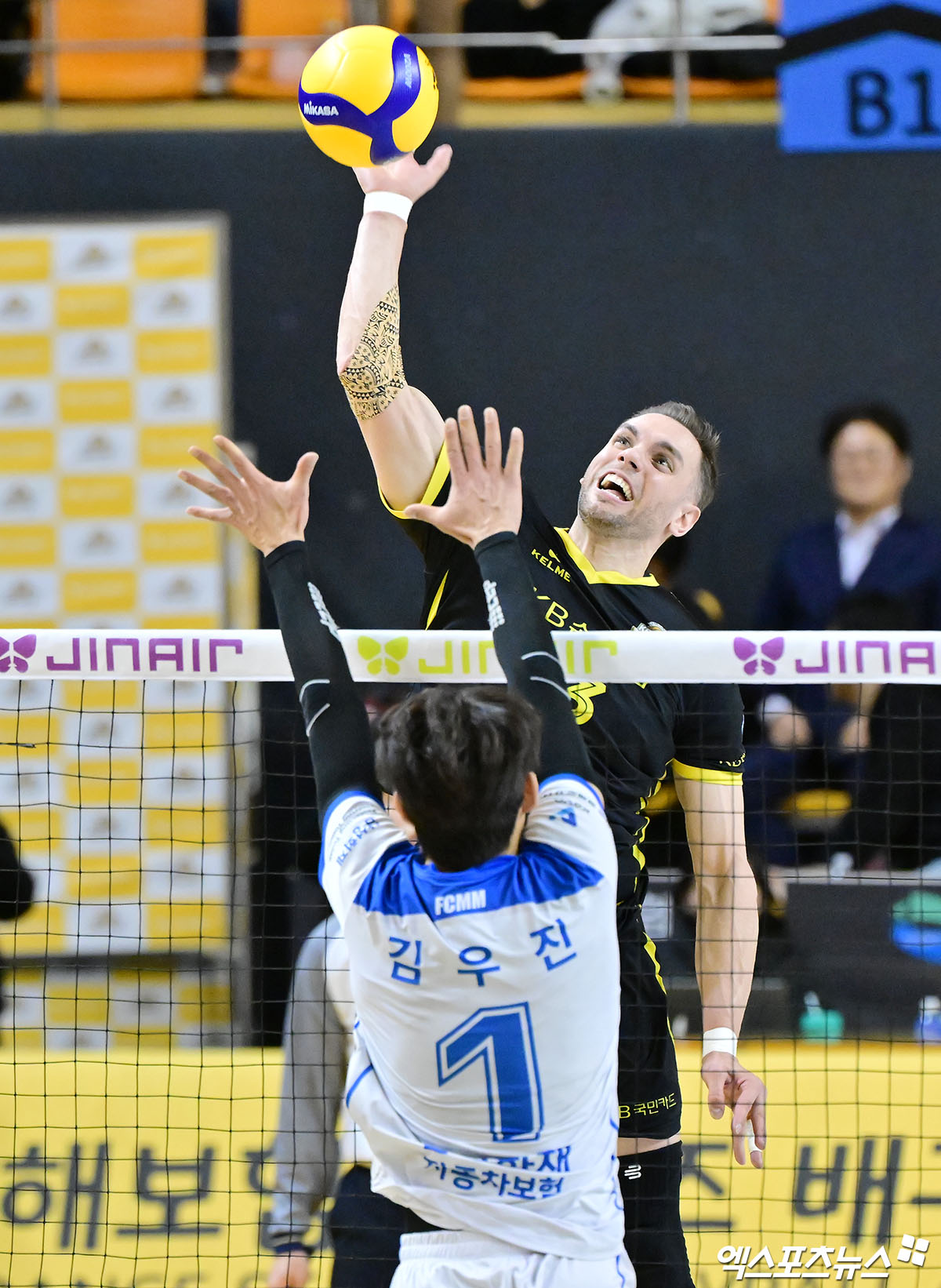 (엑스포츠뉴스 의정부, 김한준 기자) 24일 오후 경기도 의정부 경민대체육관에서 열린 '진에어 2025-2026 V-리그' KB손해보험과 삼성화재의 경기, KB손해보험 비예나가 공격을 시도하고 있다.