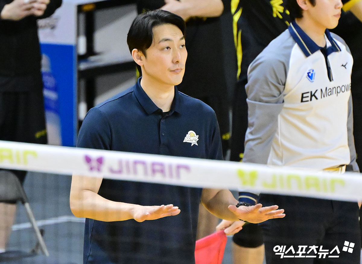 (엑스포츠뉴스 의정부, 김한준 기자) 24일 오후 경기도 의정부 경민대체육관에서 열린 '진에어 2025-2026 V-리그' KB손해보험과 삼성화재의 경기, KB손해보험 하현용 감독대행이 선수들을 격려하고 있다.