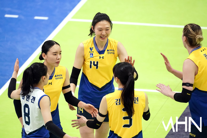(MHN 수원, 박태성 기자) 24일 경기도 수원실내체육관에서 '진에어 2025~2026 V-리그' 여자부 6라운드 현대건설(2위 56점 19승 11패)과 한국도로공사(1위 59점 21승 9패) 경기가 열렸다.