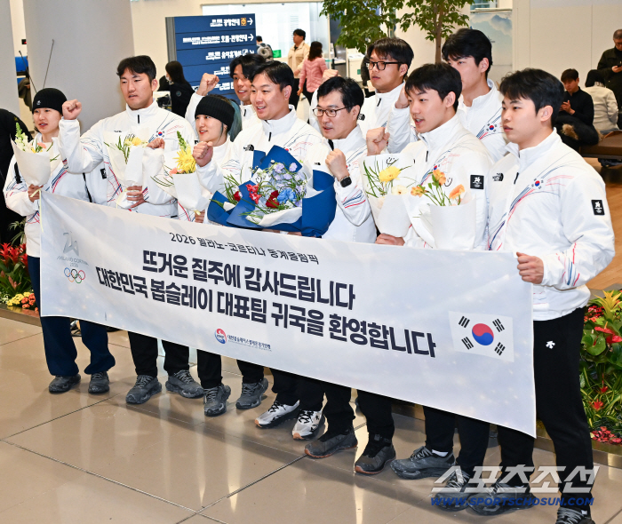 2026 밀라노·코르티나담페초 동계올림픽을 마친 대한민국 선수단 봅슬레이 대표팀이 24일 인천국제공항을 통해 귀국해 기념촬영을 하고 있다.인천공항=허상욱 기자wook@sportschosun.com/2026.02.24/