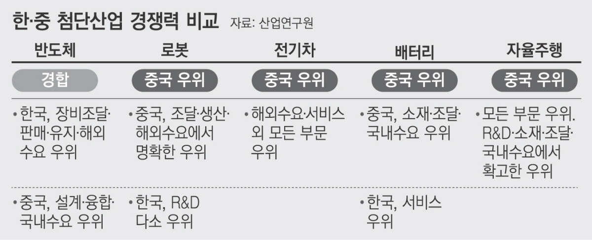 중국이 로봇뿐 아니라 전기차·배터리·자율주행 등은 물론 비메모리 반도체까지 첨단산업 전반에서 한국보다 우위에 있다는 조사 결과가 나왔다.