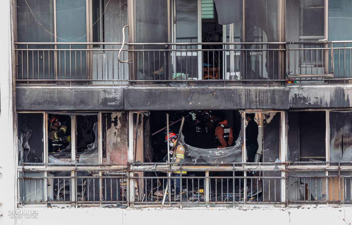 이날 오전 찾은 화재 현장은 사고의 여파가 고스란히 남아 있었다. 불이 난 세대 내부는 까맣게 탔고, 인접한 세대와 위층까지 검은 그을음이 번지고 유리창이 깨져 있었다. 아파트 복도와 우편함 주변에는 주민들이 대피할 때 사용한 것으로 보이는 물에 젖은 수건들이 널브러져 있었다. 검댕이 묻은 손으로 분주히 오가는 주민들의 모습도 눈에 띄었다.