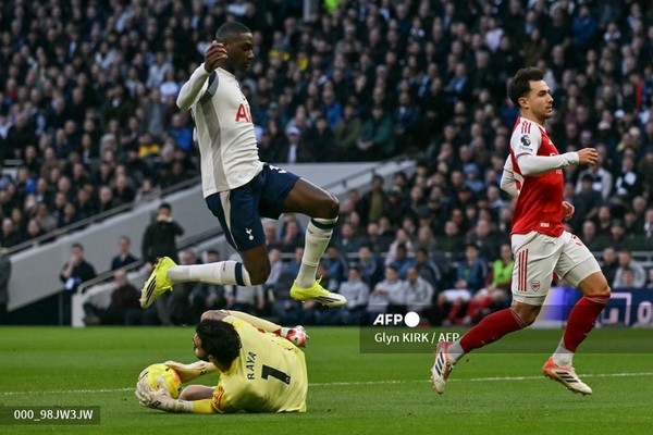 (영국=국제뉴스) 김현승 기자 = 22일(현지시간) 영국 런던 토트넘 홋스퍼 스타디움에서 열린 토트넘 홋스퍼와 아스널의 2025~26 잉글랜드 프리미어리그(EPL) 경기에서 토트넘의 란달 콜로 무아니(39번, 왼쪽 위)가 아스널의 골키퍼 다비드 라야(1번, 왼쪽 아래)를 뛰어넘고 있다.