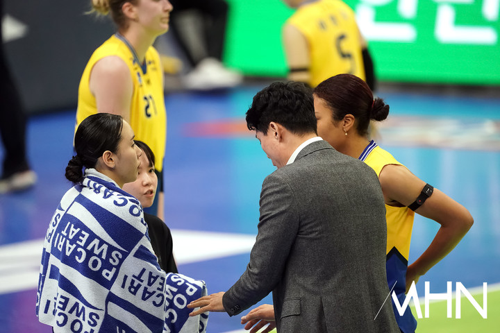 (MHN 수원, 박태성 기자) 24일 경기도 수원실내체육관에서 '진에어 2025~2026 V-리그' 여자부 6라운드 현대건설(2위 56점 19승 11패)과 한국도로공사(1위 59점 21승 9패) 경기가 열렸다.
