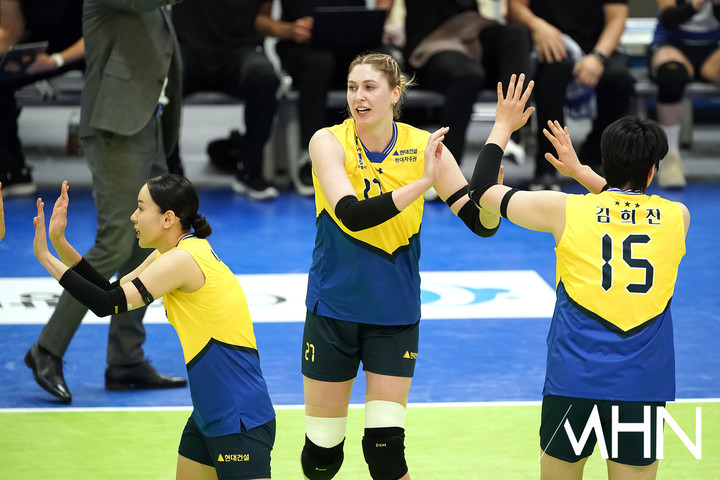 (MHN 수원, 박태성 기자) 24일 경기도 수원실내체육관에서 '진에어 2025~2026 V-리그' 여자부 6라운드 현대건설(2위 56점 19승 11패)과 한국도로공사(1위 59점 21승 9패) 경기가 열렸다.