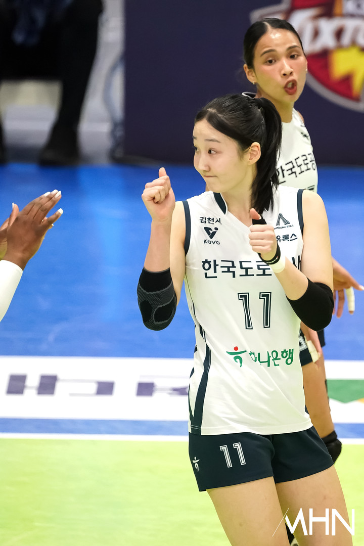 (MHN 수원, 박태성 기자) 24일 경기도 수원실내체육관에서 '진에어 2025~2026 V-리그' 여자부 6라운드 현대건설(2위 56점 19승 11패)과 한국도로공사(1위 59점 21승 9패) 경기가 열렸다.