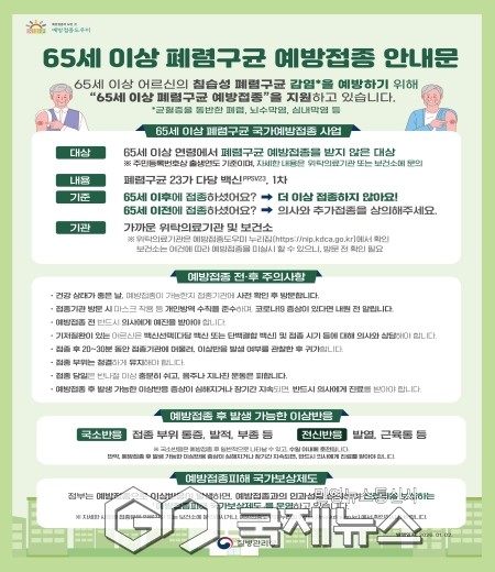 폐렴구균 예방접종은 65세 이상 어르신을 대상으로 평생 1회 접종하는 백신으로, 고령층은 면역력 저하로 감염 위험이 높고, 기저질환이 있는 경우 중증으로 진행될 가능성이 커 예방접종을 통한 사전 예방이 중증 합병증을 효과적으로 예방할 수 있다. 2026년 새롭게 65세가 되는 1961년생(1961년 12월 31일 이전 출생자)도 국가예방접종 지원 대상에 포함돼 무료 접종이 가능하다.