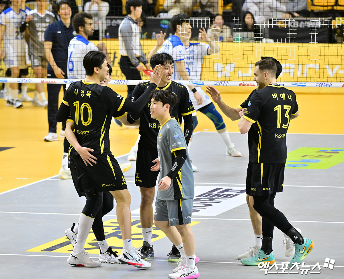 이날 경기에서 승리한 KB손해보험 선수들이 기뻐하고 있따.