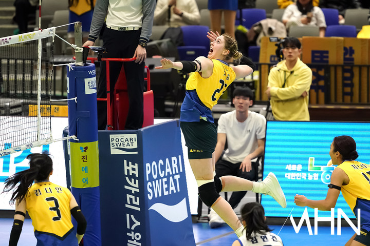(MHN 수원, 박태성 기자) 24일 경기도 수원실내체육관에서 '진에어 2025~2026 V-리그' 여자부 6라운드 현대건설(2위 56점 19승 11패)과 한국도로공사(1위 59점 21승 9패) 경기가 열렸다.