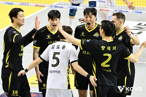 (서울=연합뉴스) 이동칠 기자 = 남자 프로배구 KB손해보험이 최하위 삼성화재를 10연패 수렁으로 밀어 넣고 3위를 굳게 지켰다.
