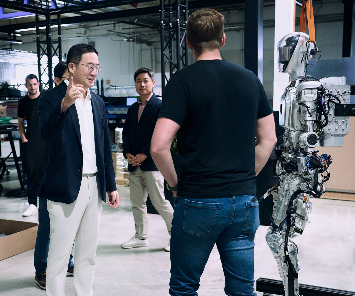 구광모 LG회장(왼쪽)이 미국 실리콘밸리에 있는 로봇 개발 스타트업 피규어 AI를 방문해 휴머노이드 로봇을 살펴보고 있다. LG그룹은 주요 계열사들의 역량을 결합한 피지컬 AI 전략을 통해 미래 시장 주도권 확보에 나서고 있다. |