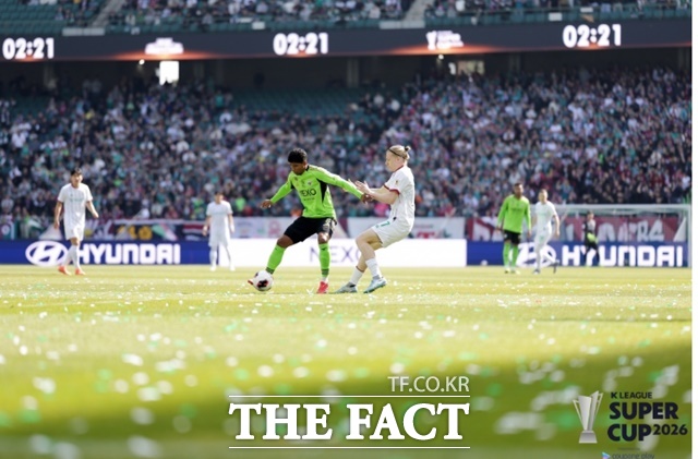 2026시즌 정규리그 개막을 정확히 일주일 앞두고 21일 전주월드컵경기장에서 열린 '쿠팡플레이 K리그 슈퍼컵 2026'은 월드컵의 해의 성공적 출발을 알리는, 완벽에 가까운 프롤로그였다./전주월드컵경기장=K리그 |