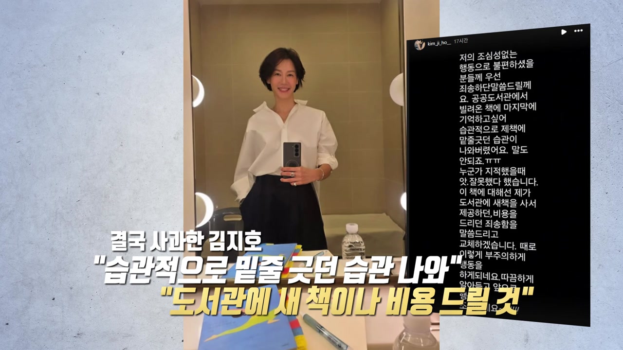 배우 김지호 씨가 도서관 책에 밑줄 그은 사진을 SNS에 올렸다가 결국 사과했습니다.