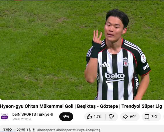 오현규의 시속 122㎞ 원더골이 25일 오전 1시 20분 기준 112만 조회수를 기록하고 있다. 사진=비인 스포츠 튀르키예 유튜브 영상 캡처 |