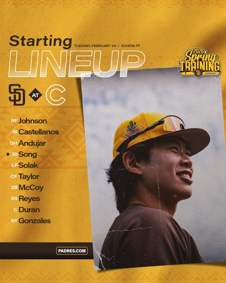 송성문은 25일(이하 한국시간) 미국 애리조나주 메사의 슬로안파크에서 열리는 2026 메이저리그 시카고 컵스와 원정 맞대결에 3루수, 4번 타자로 출격한다.