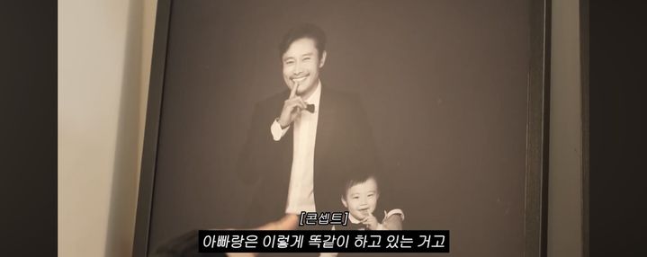 이병헌과 어린 시절 준후 군이 같은 포즈를 취한 모습이 담긴 사진이다. 준후 군은 이병헌과 이민정을 쏙 빼닮은 이목구비로 눈길을 끌었다.