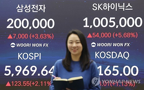 전날 코스피는 전장보다 123.55포인트(2.11%) 오른 5,969.64에 거래를 마감했다.