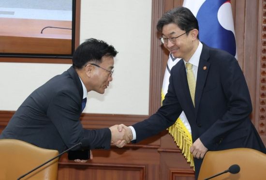 이억원 금융위원장(오른쪽)이 25일 서울 종로구 정부서울청사에서 열린 경제관계장관회의 겸 산업경쟁력강화관계장관회의에서 참석하며 박상진 산업은행 회장과 인사를 나누고 있다.