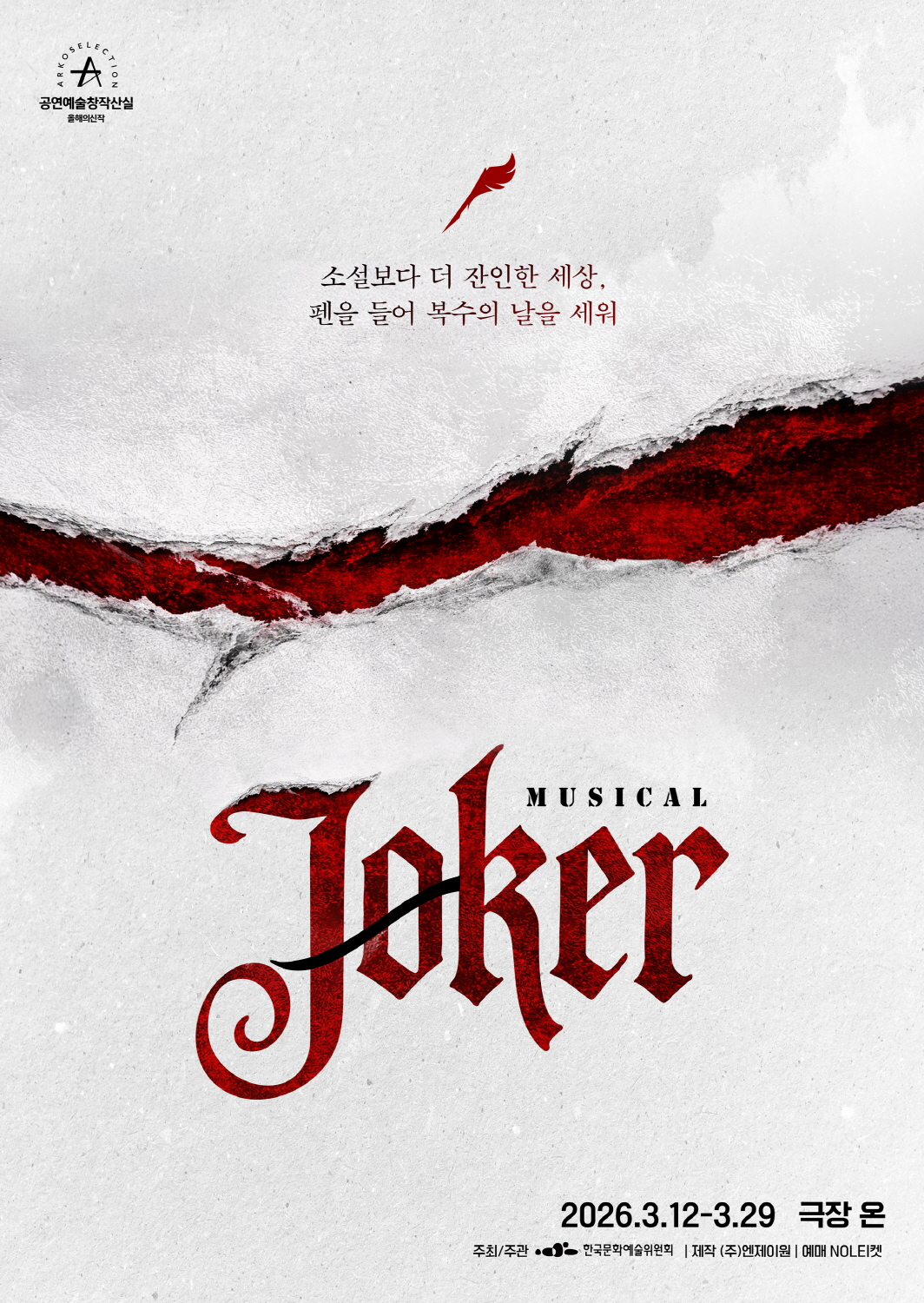 한국문화예술위원회가 선정한 제18회 공연예술창작산실 '올해의 신작' 뮤지컬 '조커'는 지난해 3월 리딩 쇼케이스를 성료한 데 이어, 약 1년 간의 개발 과정을 통해 작품의 완성도를 한층 끌어올려 창작 초연 무대로 관객들을 만난다. 특히, 작품은 지난 23일 진행된 티켓 오픈 직후 예매처 NOL 티켓에서 창작뮤지컬 부문 랭킹 1위를 석권하며 본 공연을 기다리는 관객들의 높은 관심을 입증한 바 있다.