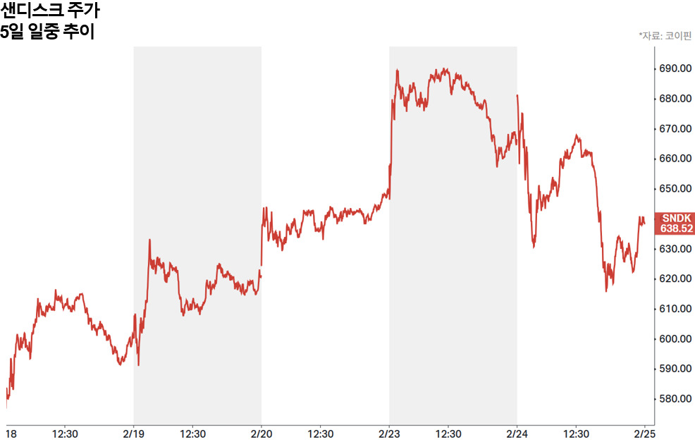 샌디스크의 주가는 24일(현지시간) 장중 8%까지 급락했다. 이날 앞서 시트론리서치의 관련 언급이 영향을 준 영향이다. 다만 마감 낙폭은 4%로 축소됐다. 시트론의 공매도 포지션 공개 직전까지 샌디스크 주가는 한 달에 걸쳐 40%, 올해 들어 175% 상승했고 최근 12개월 사이 1200% 넘게 급등한 상태였다.