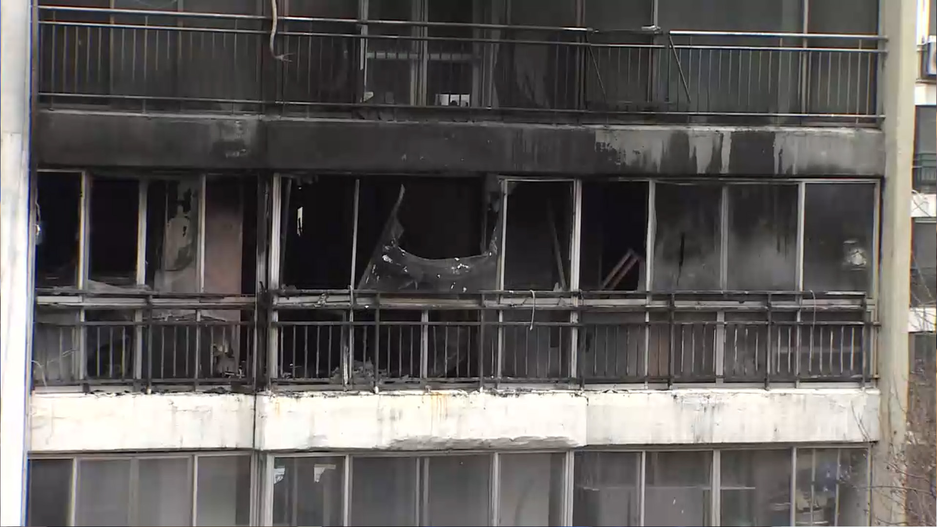 아파트 외벽이 시커멓게 그을려있고요, 유리창도 깨져있는 모습입니다.