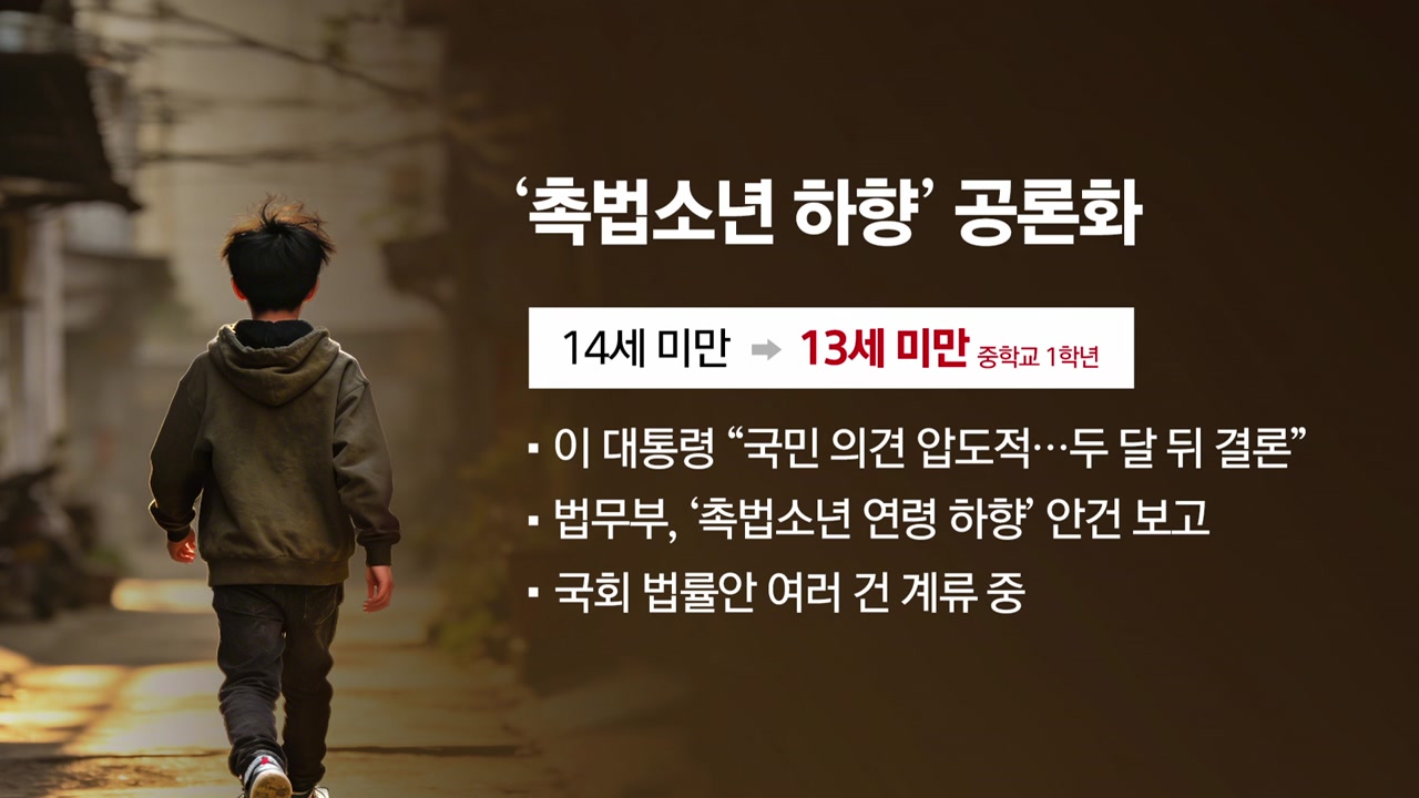 지금 현재는 형사 미성년자 기준이 14세입니다. 즉 촉법소년이라고 하는 것은 10~13세까지 법에는 저촉이 되지만 형사 미성년자에 해당이 되기 때문에 사실상 형사 처분을 받지 않는 그러한 소년법의 특례를 받는 어린 범죄자들이 범하는 범죄에 해당하는 얘기인데요. 그런데 이 기준 자체가 1953년도에 마련됐기 때문에 벌써 72년 전이죠. 그렇다면 그때의 소년과 지금의 소년의 기준이 범죄연령적 측면에서 보면 지금 상당히 발달이 되어 있고 범죄가 그만큼 지능화되어 있는데 나이가 어리다고 해서 사실 흉악범과 별다름 없는 소년 흉악범들이 처벌을 받지 않게 되는 문제는 빨리 해결이 되어야 되는데 이것은 하나의 형사 정책적 결단이 아니겠느냐. 왜냐하면 지금 시대가 벌써 많이 변했고 또 학습하는 행위 조정 능력도 발전이 되어 있는데 법은 70년 전 기준이다. 그렇다고 본다면 이것은 결단의 문제인데 조금 더 정교하게 공론화의 과정을 거쳐보자고 하는 것이 지금 대통령의 제안 사항이고요. 그래서 이걸 무작정 기한 없이 토론만 할 수는 없으니까 2개월의 기한을 두어서 구체적인 주무장관인 양성평등부장관이 이것을 주관해서 어쨌든 2개월 동안 찬반 양론, 그리고 합리적인 결론을 내보자고 하는 그런 내용으로 손질의 방향이 정해진 셈이죠.