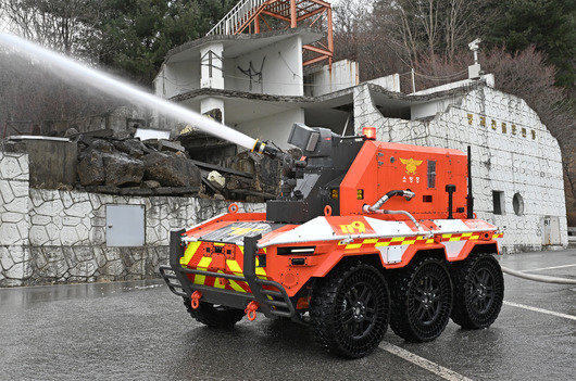 이날 기부된 로봇은 현대자동차그룹이 소방청과 함께 개발한 원격 화재 진압장비 '무인소방로봇' 4대다. 재난 환경에서 소방관의 부상 위험을 낮추는 것을 목표로 소방관들의 현장 의견을 적극 반영하고 그룹사의 기술력이 집약됐다.