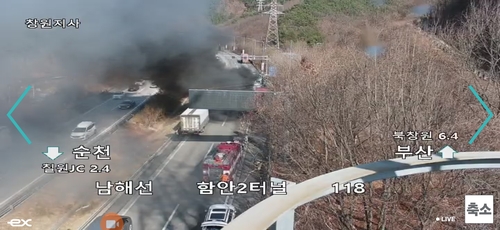 오늘(25일) 오후 2시 40분쯤 경남 함안군 칠원읍 남해고속도로 부산 방면 함안2터널 인근을 달리던 화물 트레일러에서 불이 났습니다.