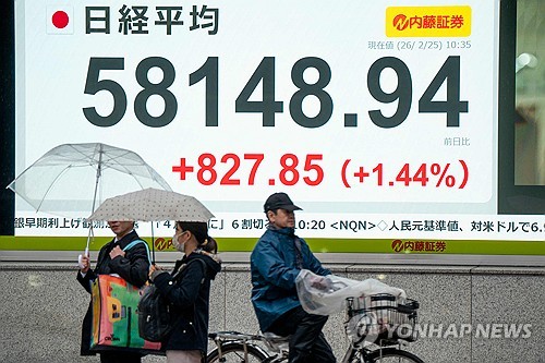 (도쿄=연합뉴스) 경수현 박상현 특파원 = 일본 증시 대표 주가지수인 닛케이225 평균주가(닛케이지수)가 25일 58,000선을 다시 돌파하며 역대 최고치를 경신했다.