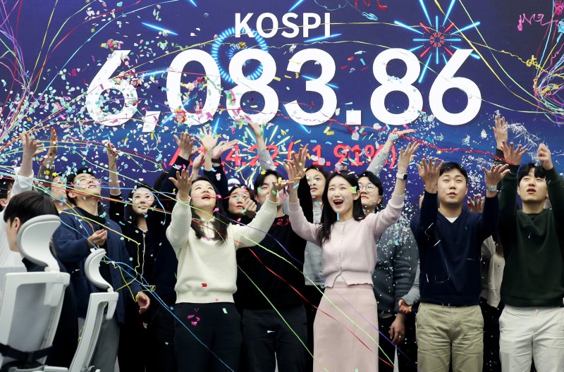 코스피가 사상 첫 6000을 돌파한 25일 서울 중구 우리은행 딜링룸에서 직원들이 축하 세리머니를 하고 있다. 뉴시스 제공 |