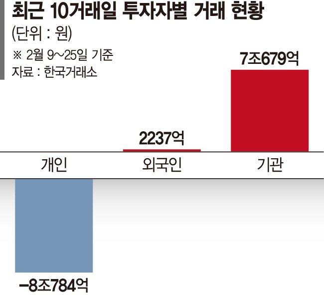 사상 첫 '코스피 6000' 입성의 주된 동력으로 기관 투자자의 매수세가 꼽히고 있다. 25일 코스피지수는 전 거래일보다 1.91% 상승한 6083.86에 거래를 마쳤다. 그동안 코스피 상승을 개미들이 주도한 것과 다르게, 5000에서 6000으로 끌어올린 건 기관이었다. 기관은 최근 10거래일 동안(2월9일~25일) 국내 증시에서 7조679억원을 순매수했다. 같은 기간 개인과 외국인이 각각 8조784억원 순매도한 것과 대조적이다. 외국인은 2237억원을 순매수해 수급에 큰 영향을 미치지 못했다.