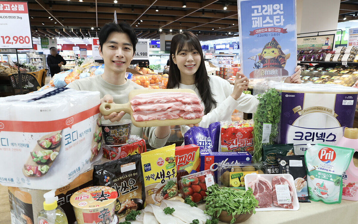 25일 이마트 용산점에서 모델들이 봄맞이 ‘고래잇 페스타‘ 1주차 행사 상품을 소개하고 있다. 이마트 제공