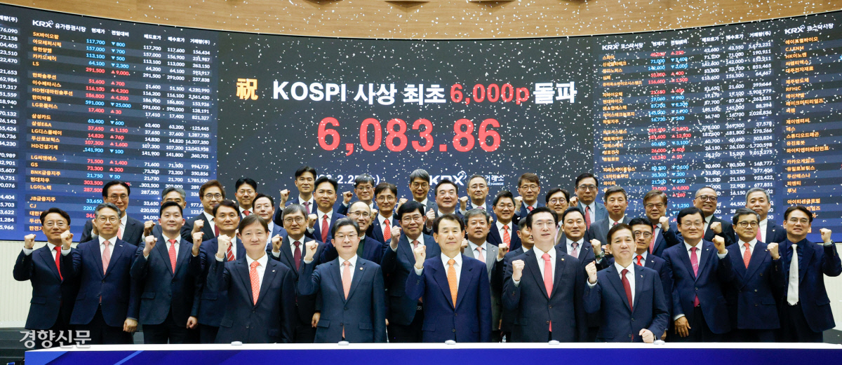 거래소도 ‘잔칫날’ 이찬진 금융감독원장, 이억원 금융위원장, 정은보 한국거래소 이사장(앞줄 왼쪽부터) 등 증권업계 기관장 및 관계자들이 25일 서울 여의도 한국거래소에서 ‘코스피 사상 첫 6000 돌파’ 축하 행사를 하고 있다. 정효진 기자 hoho@kyunghyang.com |