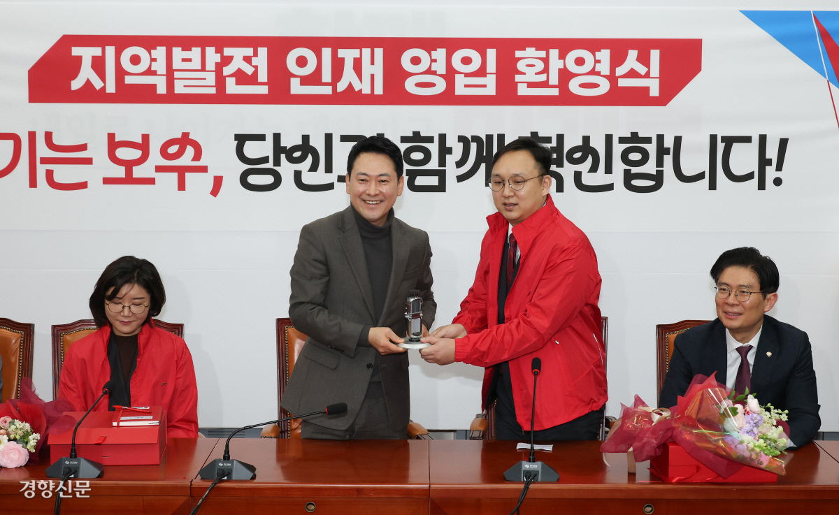 지선 인재로 회계사·원전 엔지니어 영입 장동혁 국민의힘 대표가 25일 국회에서 열린 지역발전 인재영입 환영식에서 정진우 현대엔지니어링 에너지영업팀 책임 매니저로부터 원자로 금속 모형을 전달받고 있다. 왼쪽은 함께 영입된 손정화 삼일회계법인 이사. 권도현 기자 lightroad@kyunghyang.com |