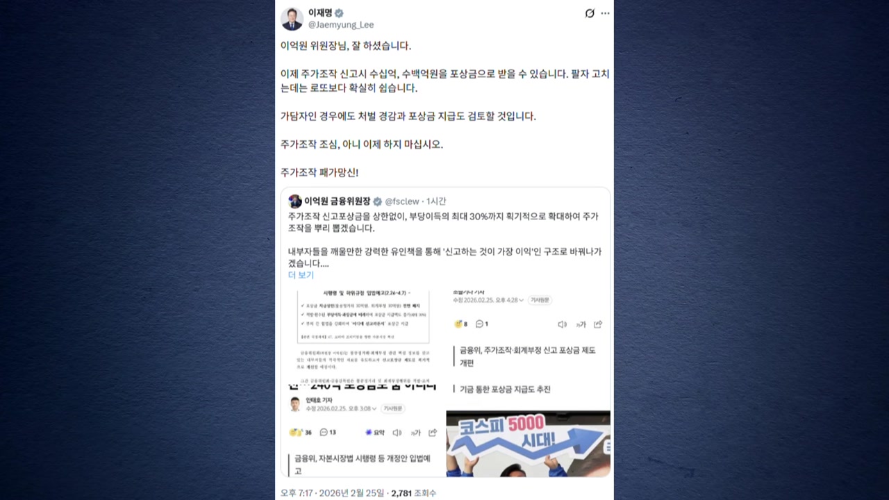 이재명 대통령은 금융위원회가 주가조작 신고 포상금 제도를 개선하기로 한 데 대해, 이억원 위원장을 공개 칭찬했습니다.