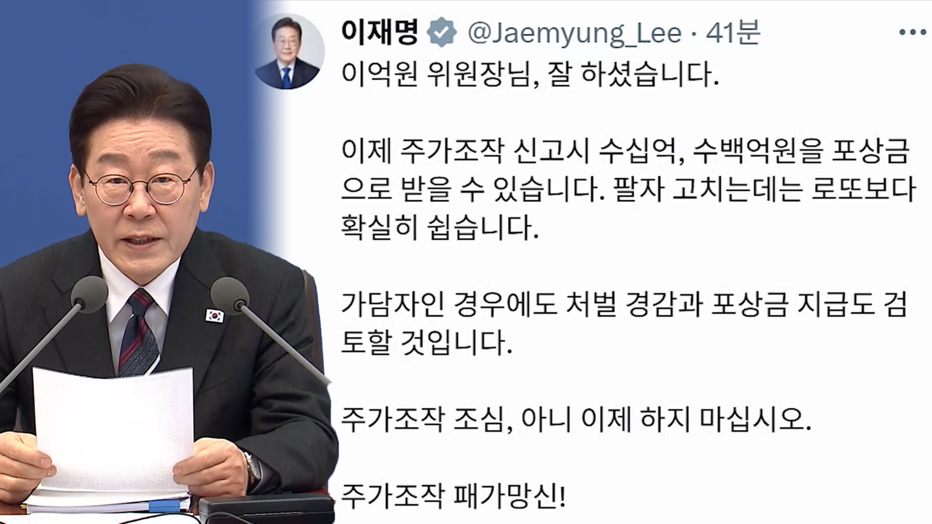 이 대통령은 오늘(25일) SNS에 주가 조작 신고 포상금 확대 정책을 소개한 이억원 금융위원장의 글을 인용하며 "잘하셨다"라고 썼습니다.
