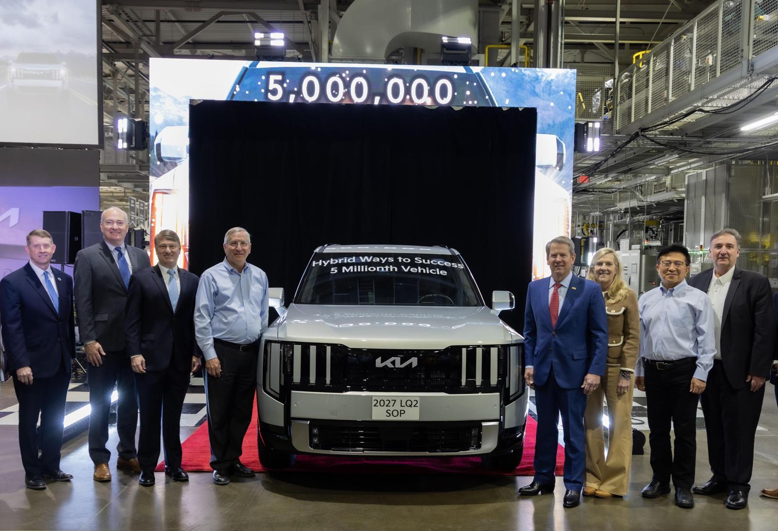 기아 조지아 법인이 500만 번째로 생산한 2027년형 기아 텔루라이드 하이브리드(가운데). 기아, 조지아주 정부 관계자들이 공장 누적 생산 500만 대 달성을 기념하고 있다. 기아 제공