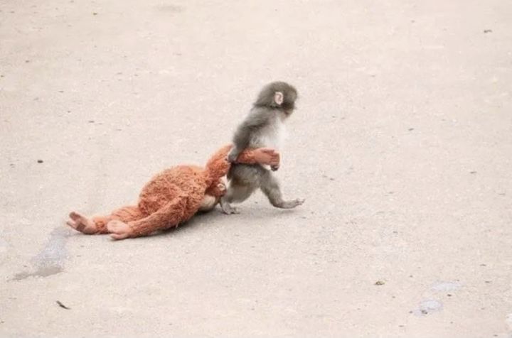 [서울=뉴시스]엄마 대신 인형을 끌고 다니는 새끼 원숭이 펀치.(사진출처: 엑스 캡처) 2026.02.18. |