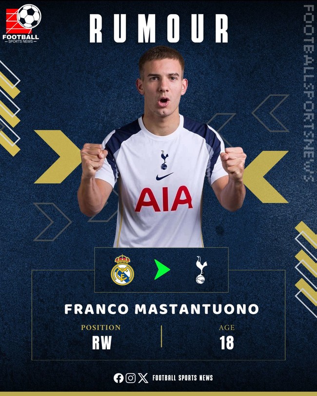 이에 올여름 새로운 공격수 영입을 원하는 토트넘. 영입 후보로 마스탄투오노가 거론됐다. 2007년생, 마스탄투오노는 아르헨티나 국적이다. 자국 명문 CA 리버 플레이트에서 성장해 2024년 데뷔했는데 드리블, 빌드업 모두 인상적 활약을 펼쳤다. 가능성을 확인한 레알이 올 시즌 6,300만 유로(약 1,061억 원)에 품어 미래를 그렸다.