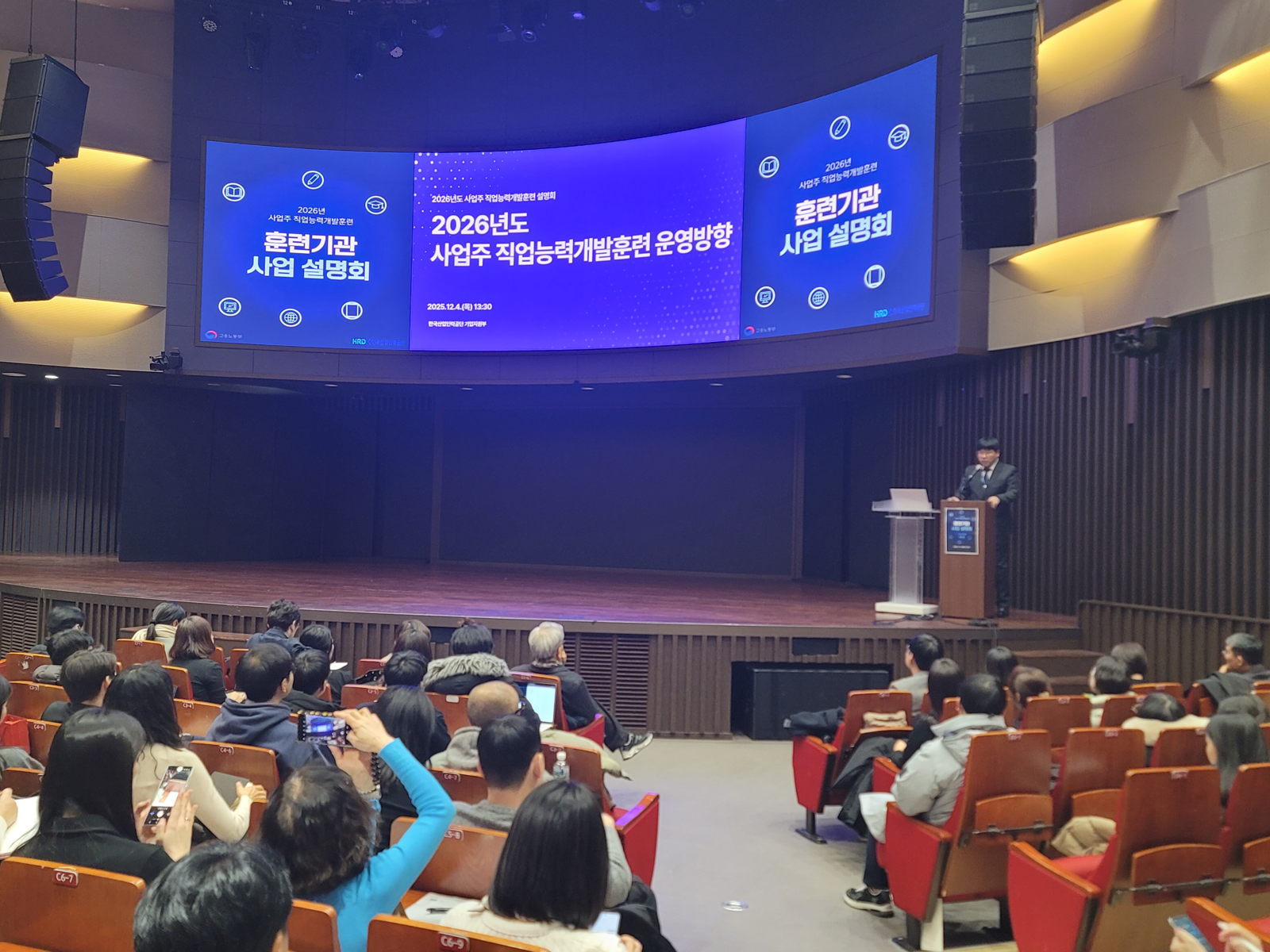 2025년 12월 4일 ‘2026년 사업주 직업능력개발훈련 운영방안 설명회’에서 약 500명의 훈련기관 및 기업 관계자를 대상으로 중소기업 AI 지원 훈련에 대한 현장 의견을 청취했다. 한국산업인력공단 제공 |