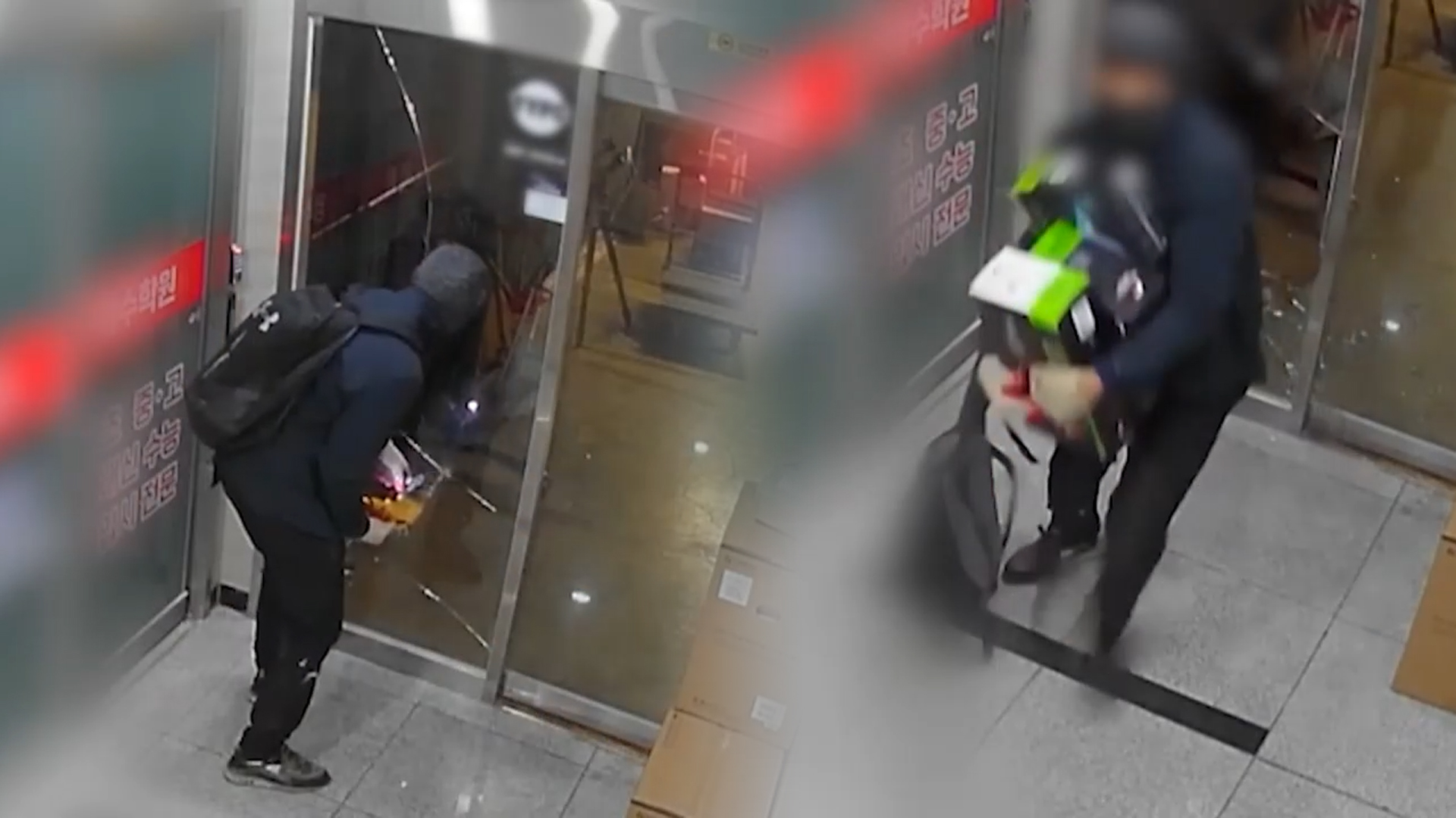 한 남성이 헤머드릴로 컴퓨터 부품 가게 유리문을 깨고 들어갑니다.