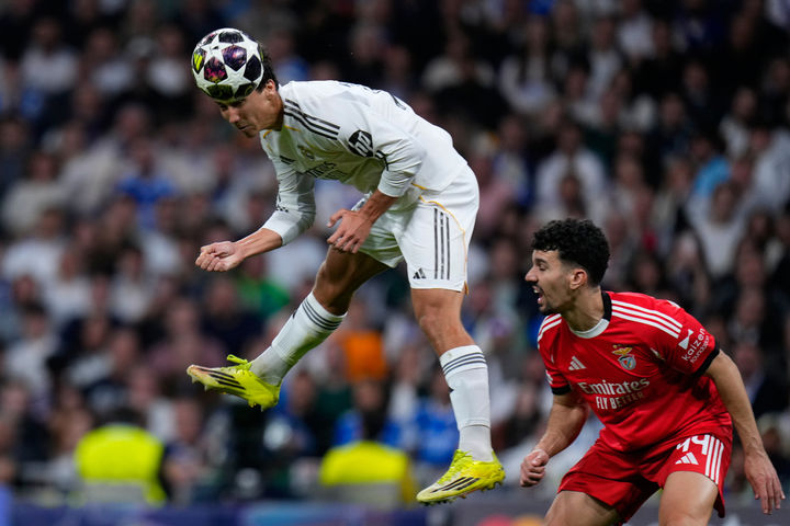 [마드리드=AP/뉴시스] 레알 마드리드의 아르다 귈러가 25일(현지 시간) 스페인 마드리드의 산티아고 베르나베우에서 열린 2025-26 유럽축구연맹(UEFA) 챔피언스리그(UCL) 플레이오프(PO) 2차전 벤피카(포르투갈)와 경기 중 공을 다투고 있다. 레알 마드리드가 벤피카를 2-1로 꺾고 1,2차전 합계 3-1로 승리해 16강에 진출했다. 2026.02.26.