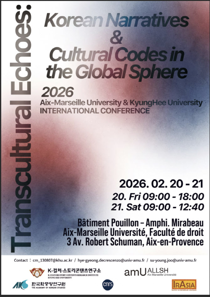 [이데일리 고규대 기자] 경희대학교 K-컬처·스토리콘텐츠연구소와 엑스마르세유대학교(Aix-Marseille University)는 지난 20일부터 21일까지 이틀간 프랑스 엑상프로방스 법과대학 Bâtiment Pouillon – Amphithéâtre Mirabeau에서 ‘Korean Narratives & Cultural Codes in the Global Sphere’를 주제로 국제학술대회를 공동 개최했다.