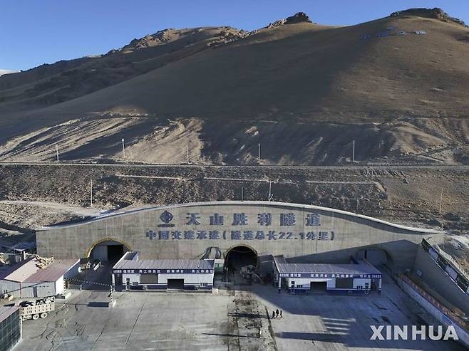 신장 톈산 산맥을 관통하는 ‘톈산 승리 터널(22.13㎞)’ 전경. 2025년 말 개통된 세계 최장급 고속도로 터널로, 해발 3,000m 이상 고산 환경에서 시공돼 산악 교통 체계를 근본적으로 재편한 인프라다. 보도에 따르면 이 구간의 산악 통행 시간은 종전 약 7시간에서 약 20분 수준으로 단축됐다고 한다. [사진: 뉴시스/신화]
