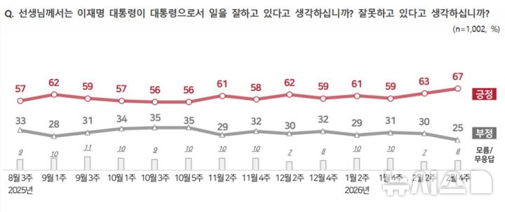 [서울=뉴시스] 김지은 기자 = 이재명 대통령의 국정 지지도가 직전 조사보다 4%포인트 상승한 67%를 기록했다는 여론조사 결과가 26일 나왔다.