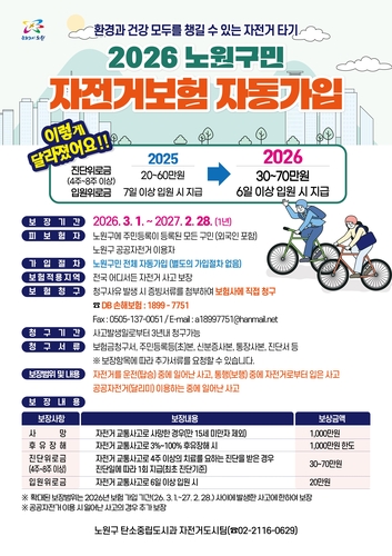 가입 대상은 노원구에 주민등록이 돼 있는 주민과 등록외국인, 노원구 공공자전거(총 190대) 이용자다. 별도의 가입 절차 없이 자동 가입된다.